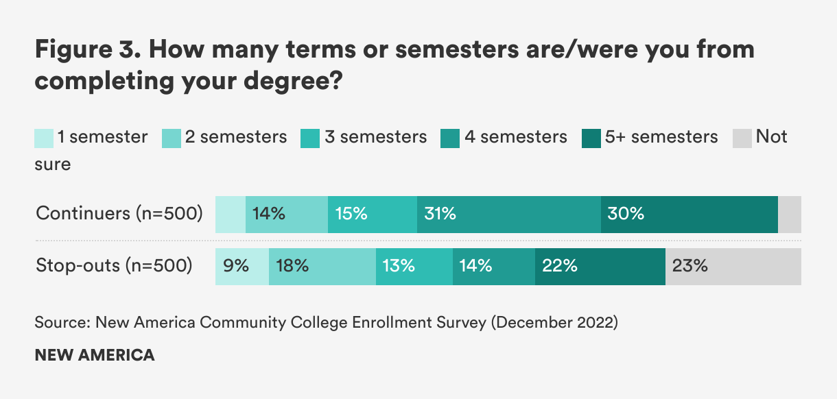 Stop-outs were also much less clear on how many semesters they were from completion of their degree compared to continuing students (23 percent of stop-outs were unsure how many semesters they were from completion compared to only 4 percent of continuers) (see Figure 3). And compared to two years ago, fewer stop-outs said they needed to complete their program to get a professional license to work in the field they were studying (37 percent said so compared to 50 percent in 2021).
