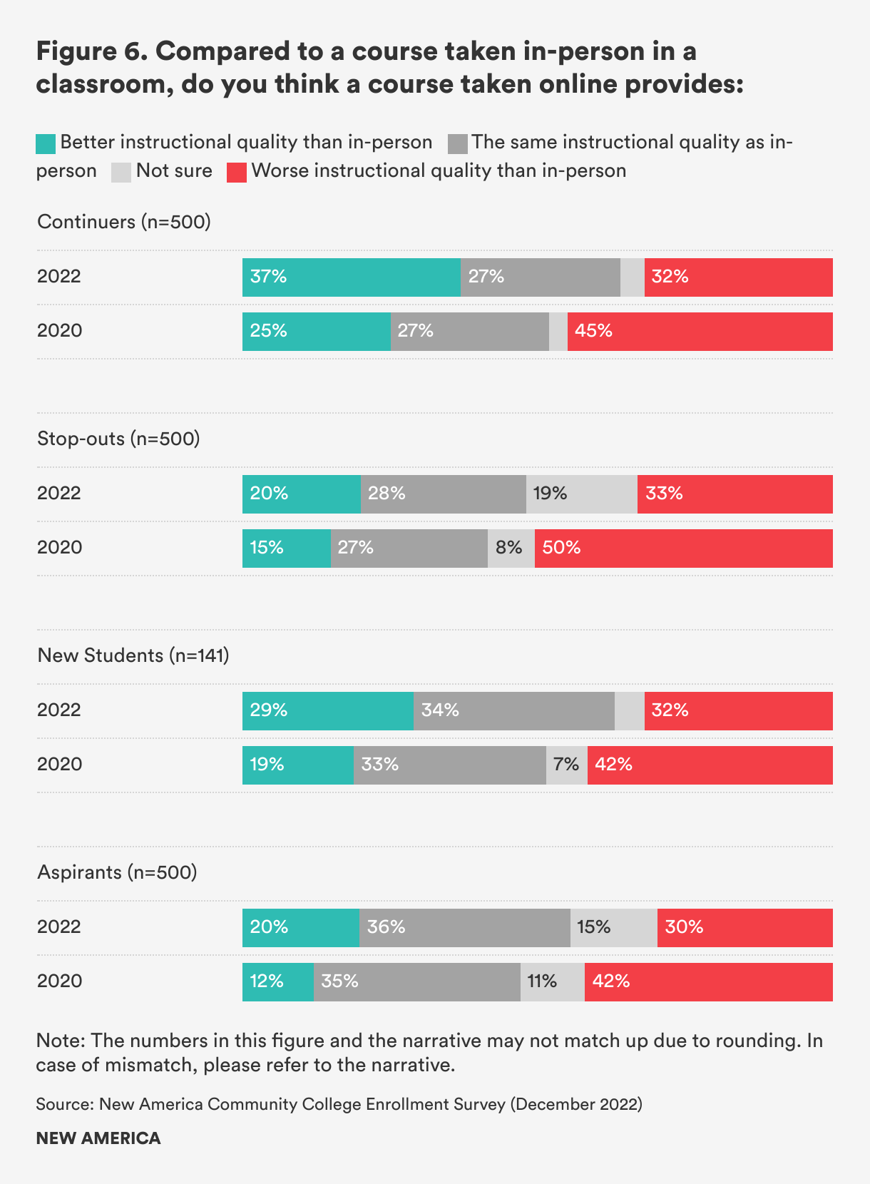 These hang-ups also emerge when students are asked how they perceive the quality of online classes in comparison to in-person classes. One notable shift is that 37 percent of continuers now feel that online coursework provides better instructional quality than in-person instruction, compared to 25 percent when we asked in 2021 (see Figure 6). This shift in numbers may be an indicator that students who have remained enrolled in their programs have become more comfortable with their online classes over time, and/or institutions and faculty have gotten better at delivering content. In contrast, only one in five stop-outs (20 percent) believe that the quality of online classes is better than that of in-person classes, and one in three (33 percent) think it’s worse.