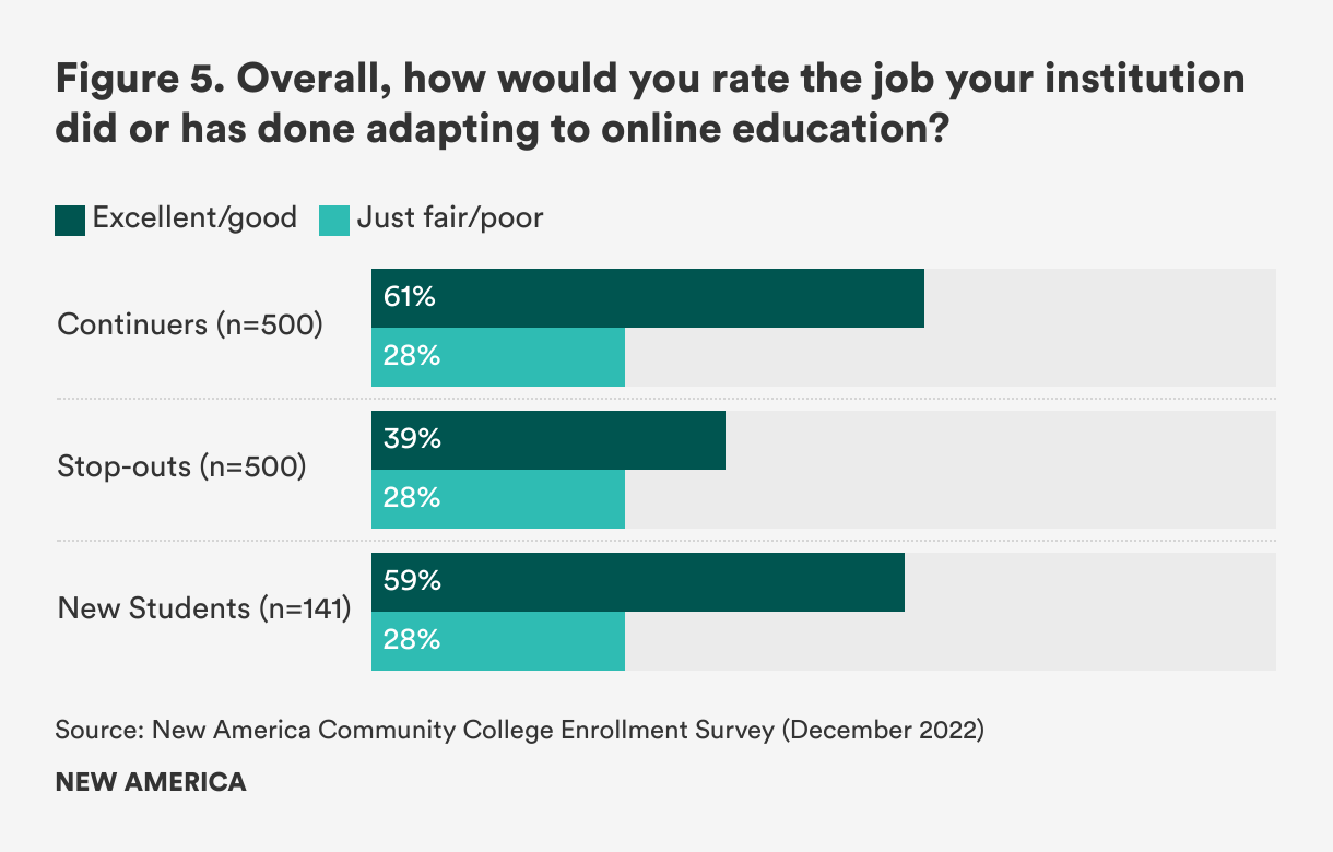 Stop-outs also differ from their enrolled peers in their opinions of online learning. Only half (50 percent) of stop-outs report satisfaction with the quality of online instruction, compared with 77 percent of continuers and 71 percent of new students (see Figure 4). Approximately six in 10 continuers (61 percent) and new students (59 percent) believe that their institution did a good job adapting to online education, but only 39 percent of stop-outs share this sentiment (see Figure 5). Less than favorable perceptions of online learning may serve as a hang-up for students who stopped out, considering that this shift occurred at the start of the pandemic.