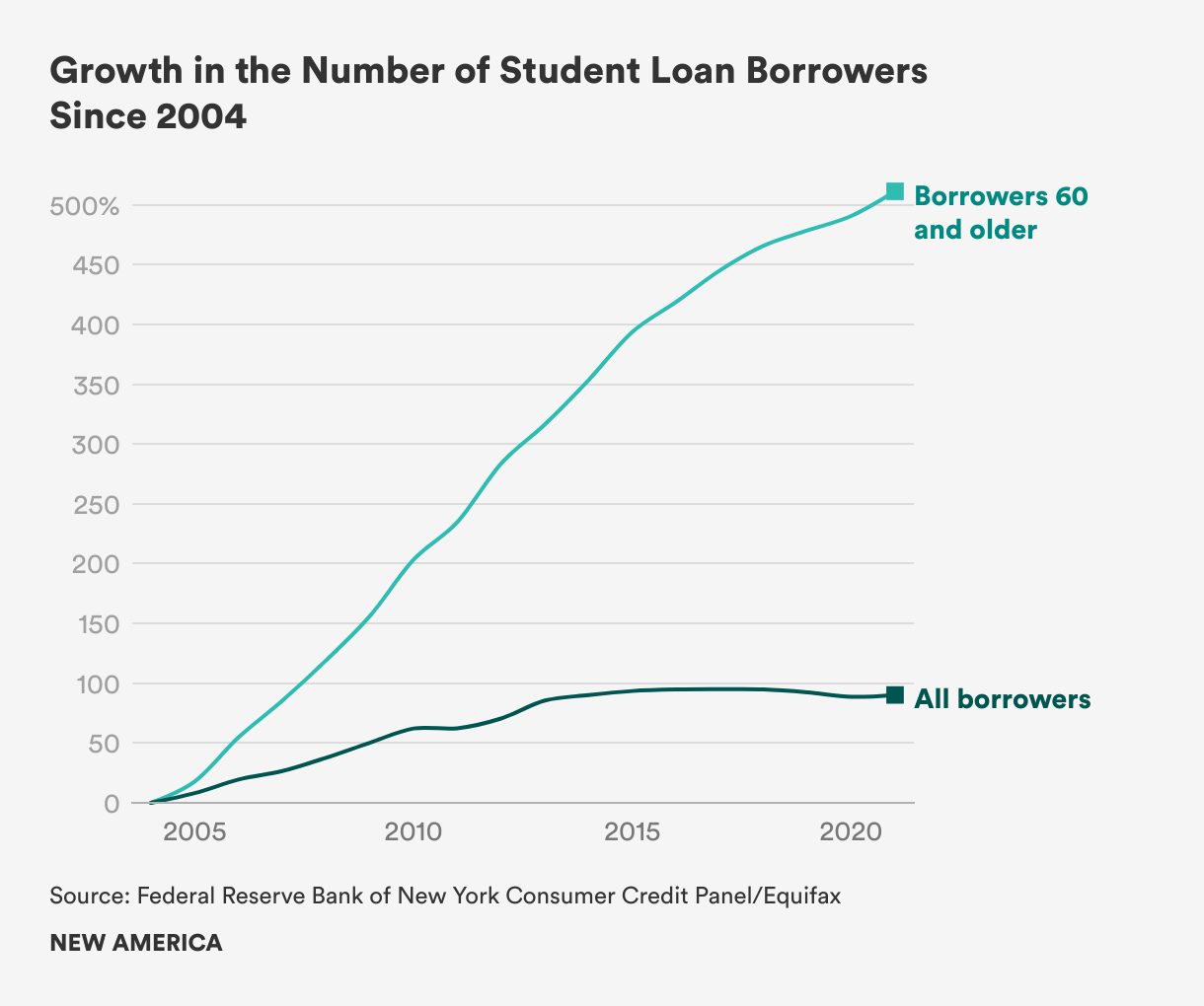 The student debt crisis has dominated headlines recently and for good reason. Credit bureau data shows that the number of student loan borrowers has almost doubled since 2004, and the outstanding value of the debt has quadrupled. This growth has been even more astronomical for those approaching retirement. The number of borrowers aged 60 and over grew six-fold since 2004, while their outstanding debt increased 19-fold. Today, 3.5 million Americans 60 and older hold over $125 billion in student loans.