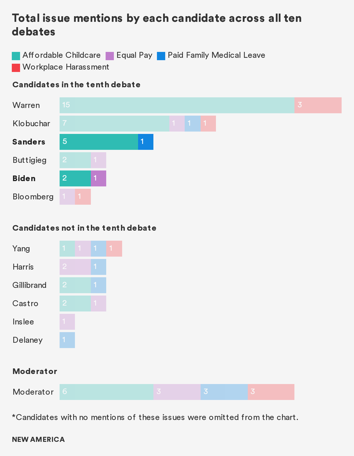 This analysis tracked how often candidates and moderators spotlighted childcare, the gender pay gap, gender-based workplace harassment, and paid family and medical leave, which affect the lives of millions of voters and their loved ones, in the 2019-2020 Democratic presidential primary debates.