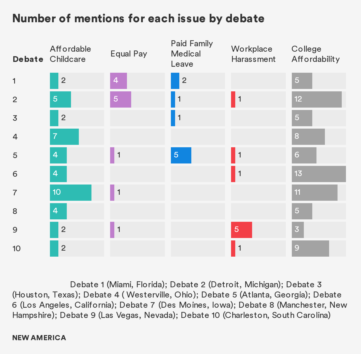 This issue came up twice during the first debate in Miami and once during the second debate in Detroit. Mentions peaked during the fifth debate in Atlanta when moderators asked one question about it. Moderators and candidates did not bring up the issue again during the remainder of debates despite the fact that virtually all working people will need paid leave from work to care for a loved one or themselves at some point in their lives.