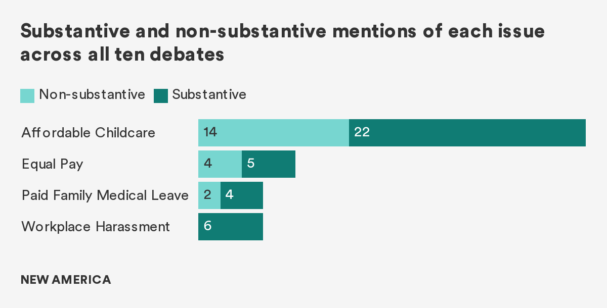 This analysis tracks how often and how substantively candidates and moderators spotlighted childcare, the gender pay gap, gender-based workplace harassment, and paid family and medical leave, which affect the lives of millions of voters and their families, in the 2019-2020 Democratic presidential primary debates.