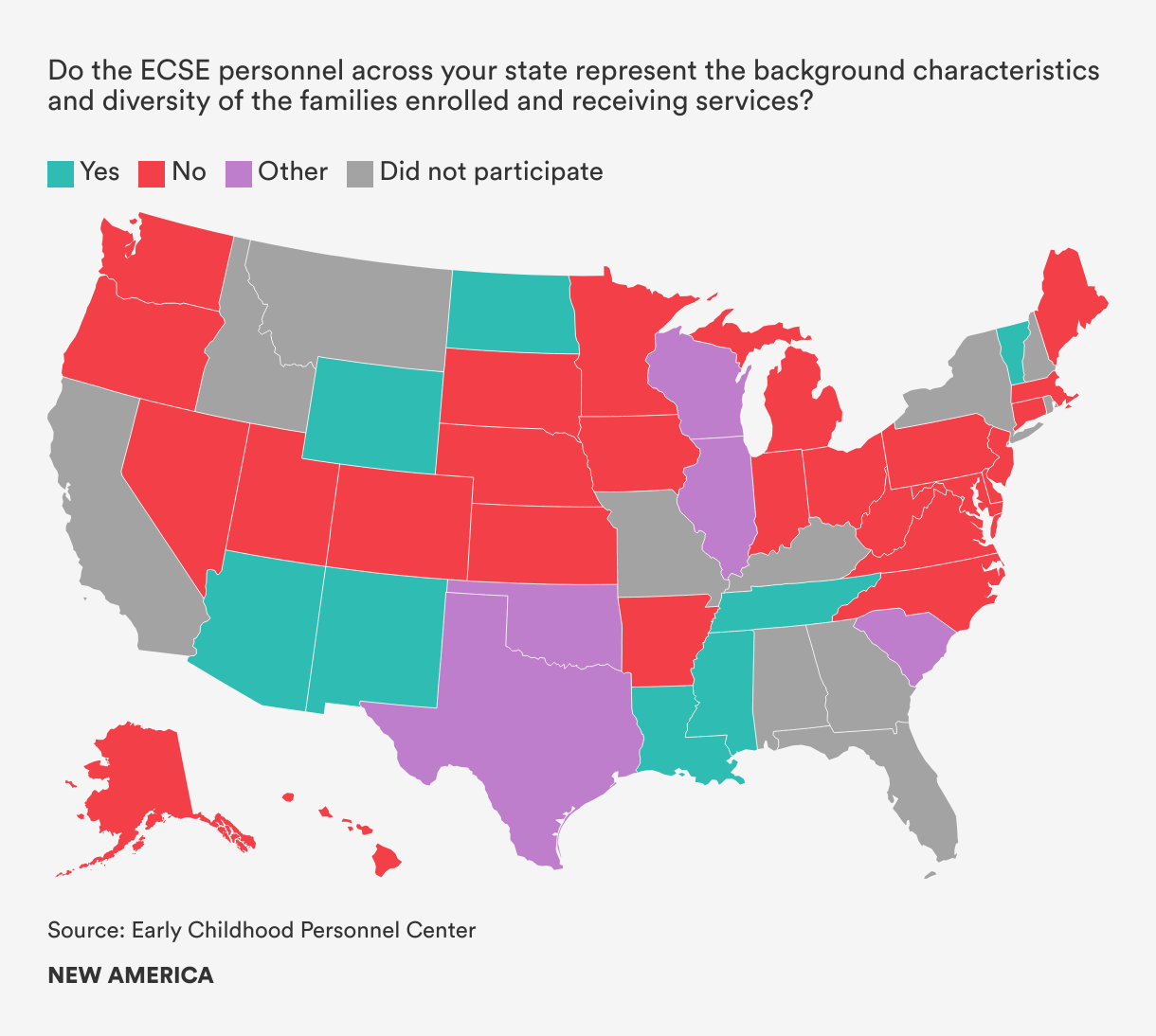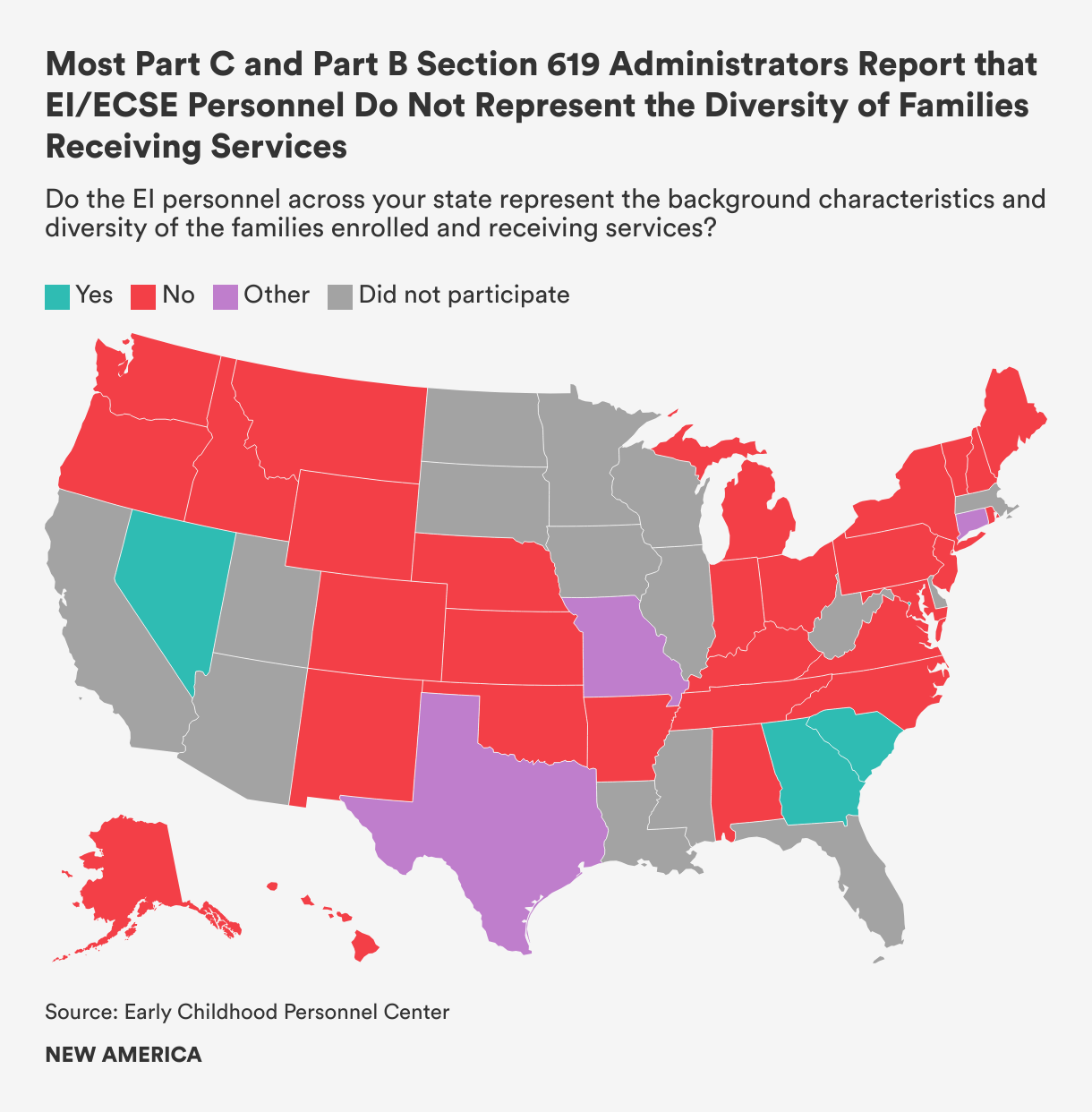 Data suggest that the demographics of professionals in the EI/ECSE fields are predominantly white, female, and monolingual. A recent survey on ECSE personnel conducted by the National Institute for Early Education Research (NIEER) found that “nearly 90 percent of early childhood special education personnel are white, 97 percent are female, and only 6 percent speak Spanish”.[1] Because the EI/ECSE workforce encompasses so many professional disciplines and employment structures, it can be difficult to collect information on the entire workforce in a systematic and consistent way, especially if the data are not required for federal IDEA grant reporting. In a 2021 survey, less than half of state Part C and Part B Section 619 administrators reported collecting workforce data on race/ethnicity, gender, and language in their data systems.