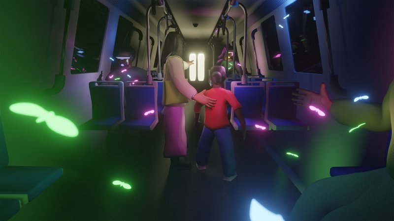 People barely noticed the pair were leaving because they were too busy searching their agents for answers. Thankfully, the door at the end of the car slid open. On the small platform connecting the cars, the air was filled with dust. The next car was even more crowded, with several people nursing injuries. Sticky coffee coated the floor, and a half-eaten churro floated in the middle of the mess.
